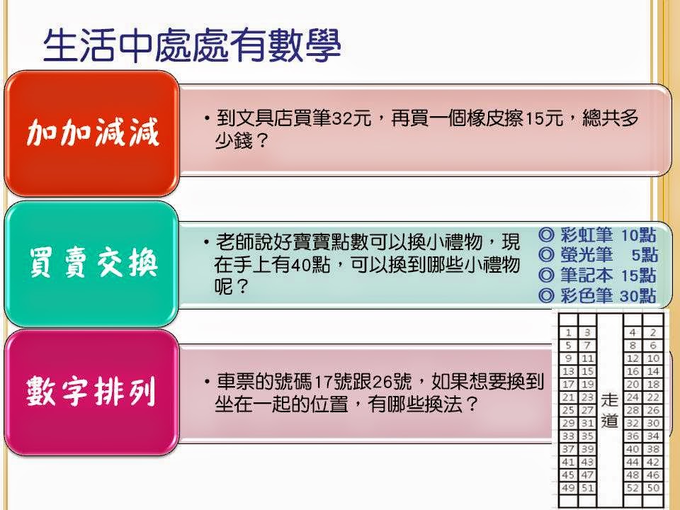《數字排列》的主題中,以車票位置為例,家長可以先帶著孩子觀察表格中數字間的關係,像是甚麼樣的數字靠走道、甚麼樣的數字靠窗、左右邊的數字分別有哪些特質,這些都可以讓孩子試著自己進行表格的敘述。接著就可以開始提出換座位的題目,怎麼換可以將2個原本距離有點遠的位置換在一起?其實換法不僅僅只有一種,都可以鼓勵孩子說出自己的想法與為什麼。