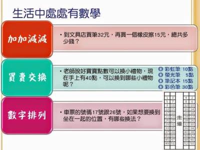 其實生活中處處都有數學概念,隨時都有應用題,以《加加減減》主題來說,買東西就是一個很常遇到的例子,像是總共多少錢、要找多少錢回來、用累加計算一樣的東西買多個多少錢,這些都可以讓孩子自己試著做出答案。
