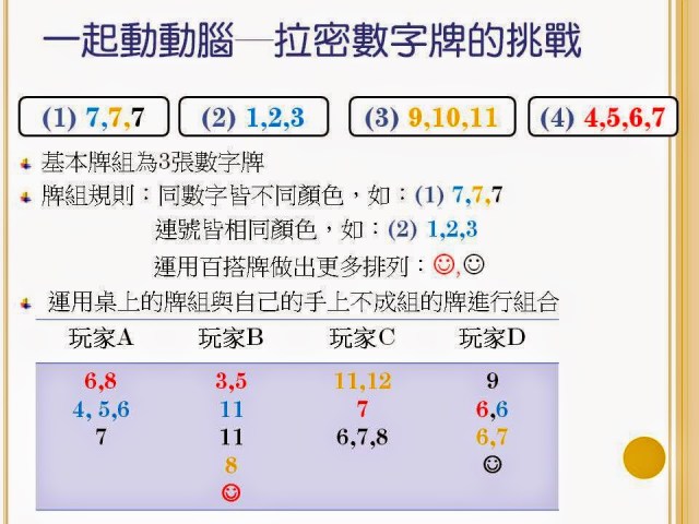 《數字排列》看起來好像是一個很簡單的主題,但是怎麼排?其中可就大有來頭囉!看看這次分享拉密數字牌的挑戰中,只是簡單的3個規則:1. 3張牌為基本牌組;2. 連號皆同顏色;3. 同數字皆不同顏色。就已經可以讓人很傷腦筋囉!方法只有一種嗎?一起來瞧瞧吧!
