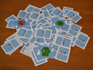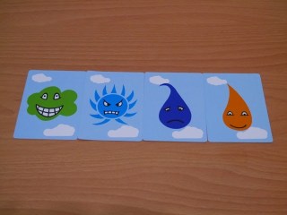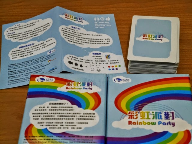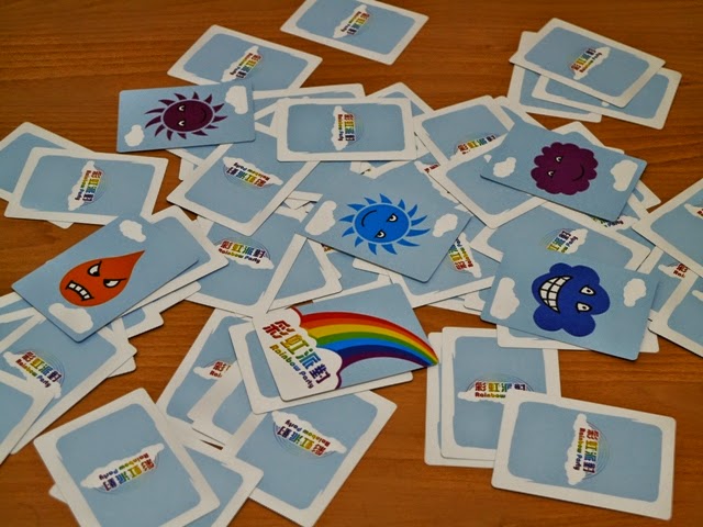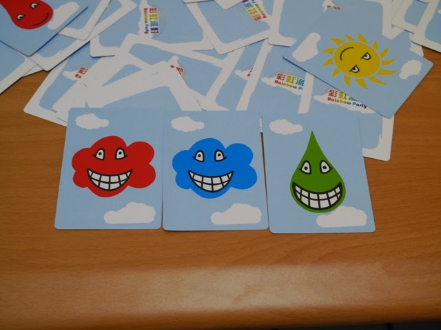 一起認識一下卡片上有哪些圖樣!首先當然是彩虹的7種顏色:紅、橙、黃、綠、藍、靛、紫;再來就是構成彩虹的3元素:雲、雨、太陽;接著發現了嗎?每一個卡片的臉上都還有自己的表情:喜、怒、哀、樂。再來還有一張「彩虹派對卡片」。