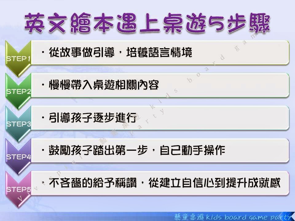 接下來就是孩子表現時間到囉!在玩桌遊的時候,就是孩子最輕鬆的時候,這時候只要鼓勵他做就對了!不管做對與否,讓孩子踏出第一步是相當重要的!如果家長希望孩子自己獨立上課,應該要越早放手,因為當父母與孩子同處在一個空間時,當孩子做完一個動作,通常會轉頭希望得到父母認可的眼光,同時卻也失去了對當下事物的專注,這一點確實是相當可惜的!當然父母都是基於關心的立場,希望了解課程內容,或是希望陪著孩子一起學習,但適時的放手也是相當重要的喔!