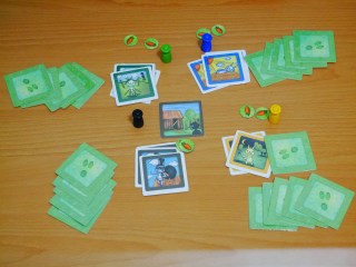 1. 將行動牌與礦藏牌洗排之後,發給每位玩家2張手牌(若有礦藏牌請繳回)。再將剩餘的排均分成4疊,成為4座山。