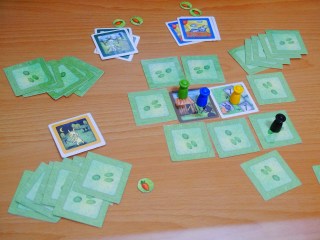 4. 接著來設置起始農田,請按照照片中的位置排列,並且請玩家將農夫代表物放到中間倉庫的位置,這就是農夫們出發的起點