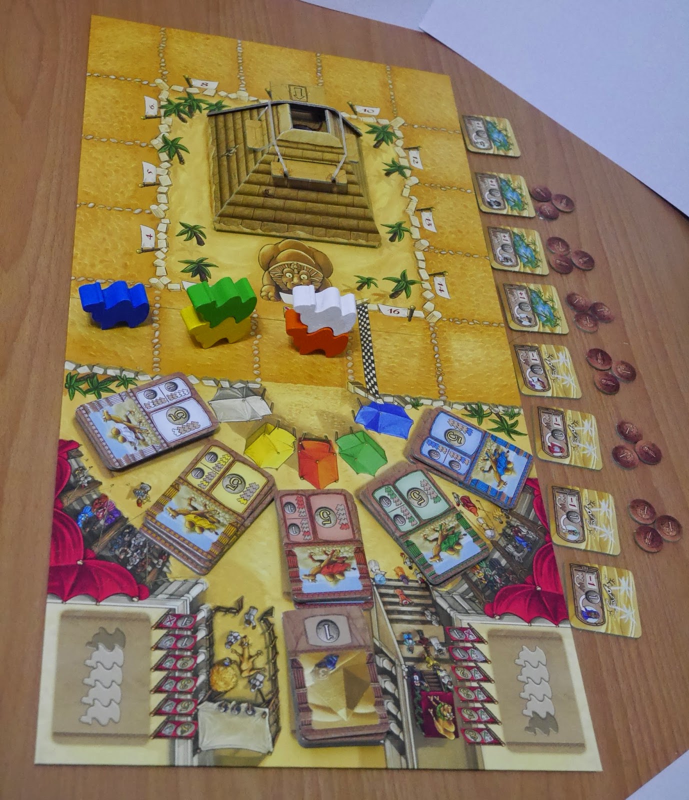 接著要進行駱駝商隊順序的設置,這次設置好剛好是藍色第一名,綠色疊在黃色上,白色疊在橘色上。是的!!!駱駝們會疊在一起,當疊在一起時,上面的名次算在前面,所以一開跑的名次分別是:第一名藍色,第二名綠色,第三名黃色,第四名白色,第五名橘色,而且駱駝會背著身上的駱駝往前跑,這又是怎麼回事?!待會就知道!