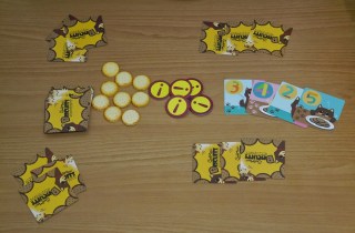 接著換最後一個玩家,他出的數字是5,剛剛好一步也不差,順利得到一個餅乾!遊戲進行到桌上沒有餅乾或是沒有驚嘆號結束,已經達到14的牌,或者是因為超過14步而得到驚嘆號的牌就直接一起洗牌後,成為新牌堆。