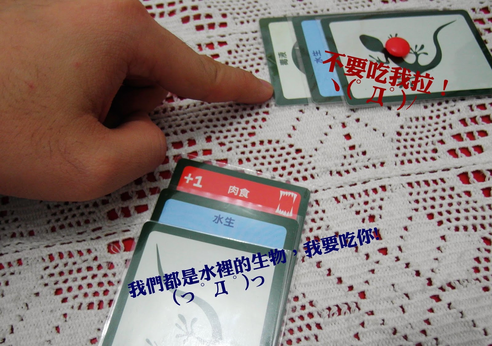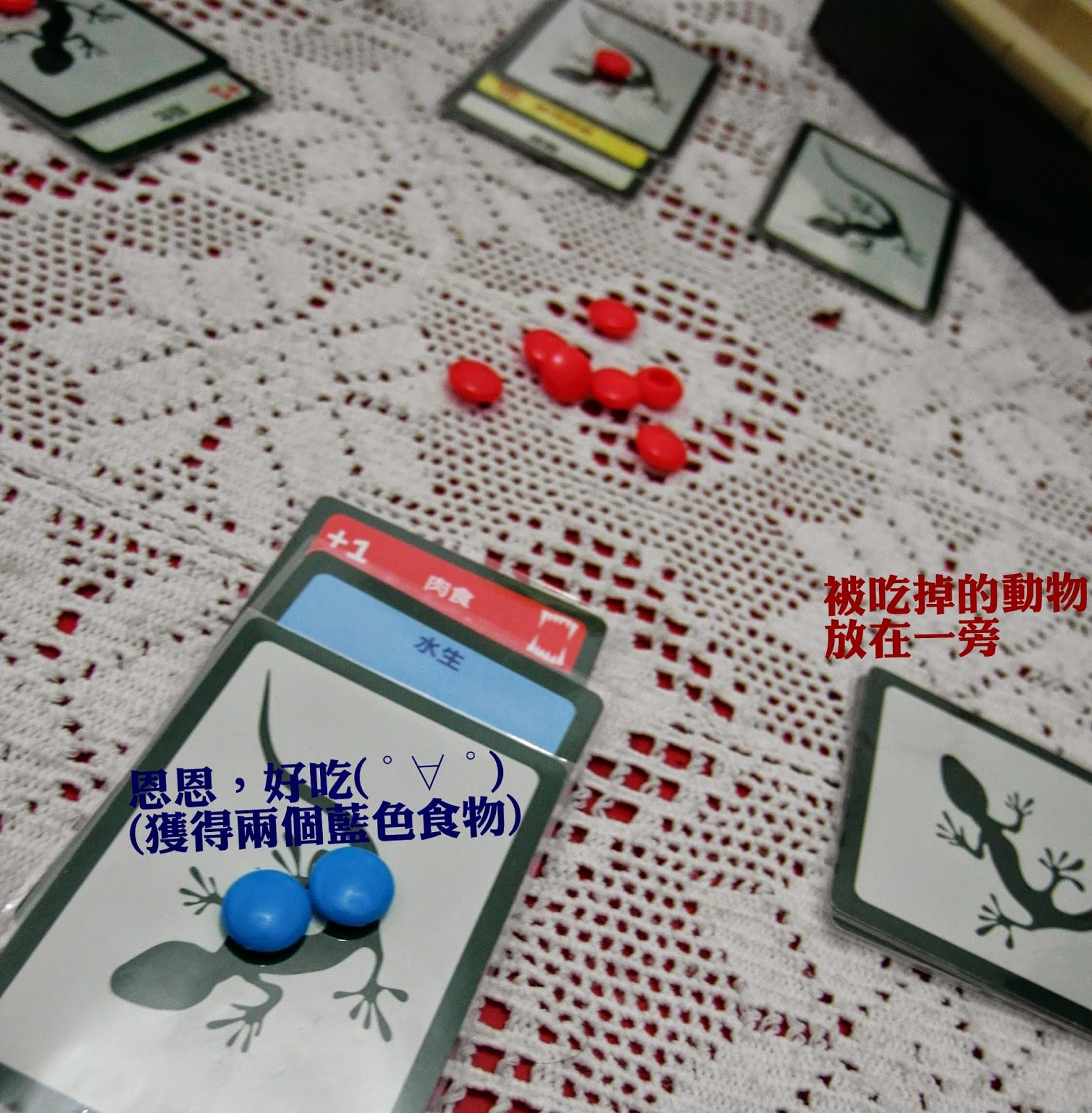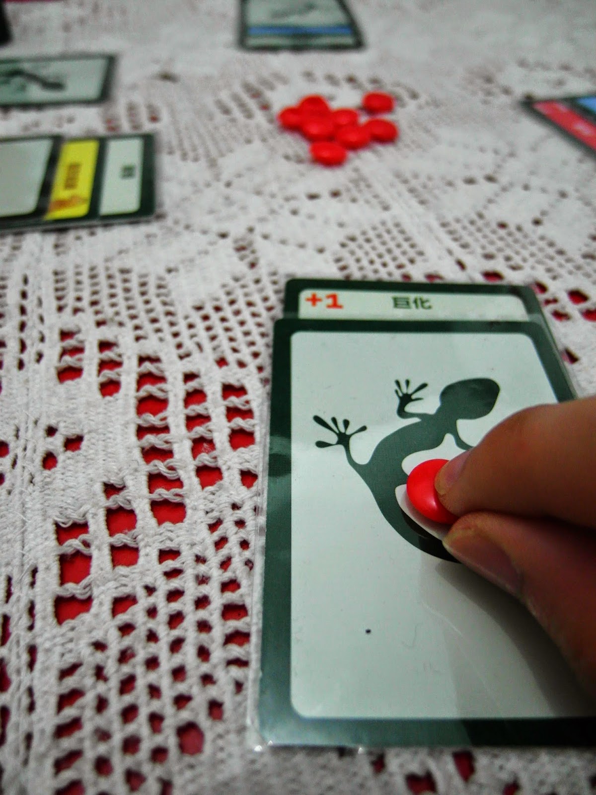 接下來每個人輪流拿1個「一般食物」放在自己的動物身上,每個動物只要1個食物就可以吃飽,當動物身上有著性狀寫「+1」時,必須多吃一個食物,像是這隻「巨化」動物,就必須要拿到2個食物才會吃飽。