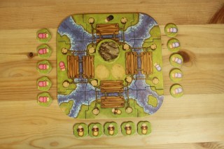 註:2人進行時只需要4塊,需要哪些圖板可參考說明書或圖板背後的擺放提示圖樣;3人遊戲時,圖版擺放與4 人相同,但請將巨石標記擋在沒有使用的羊群顏色出口。