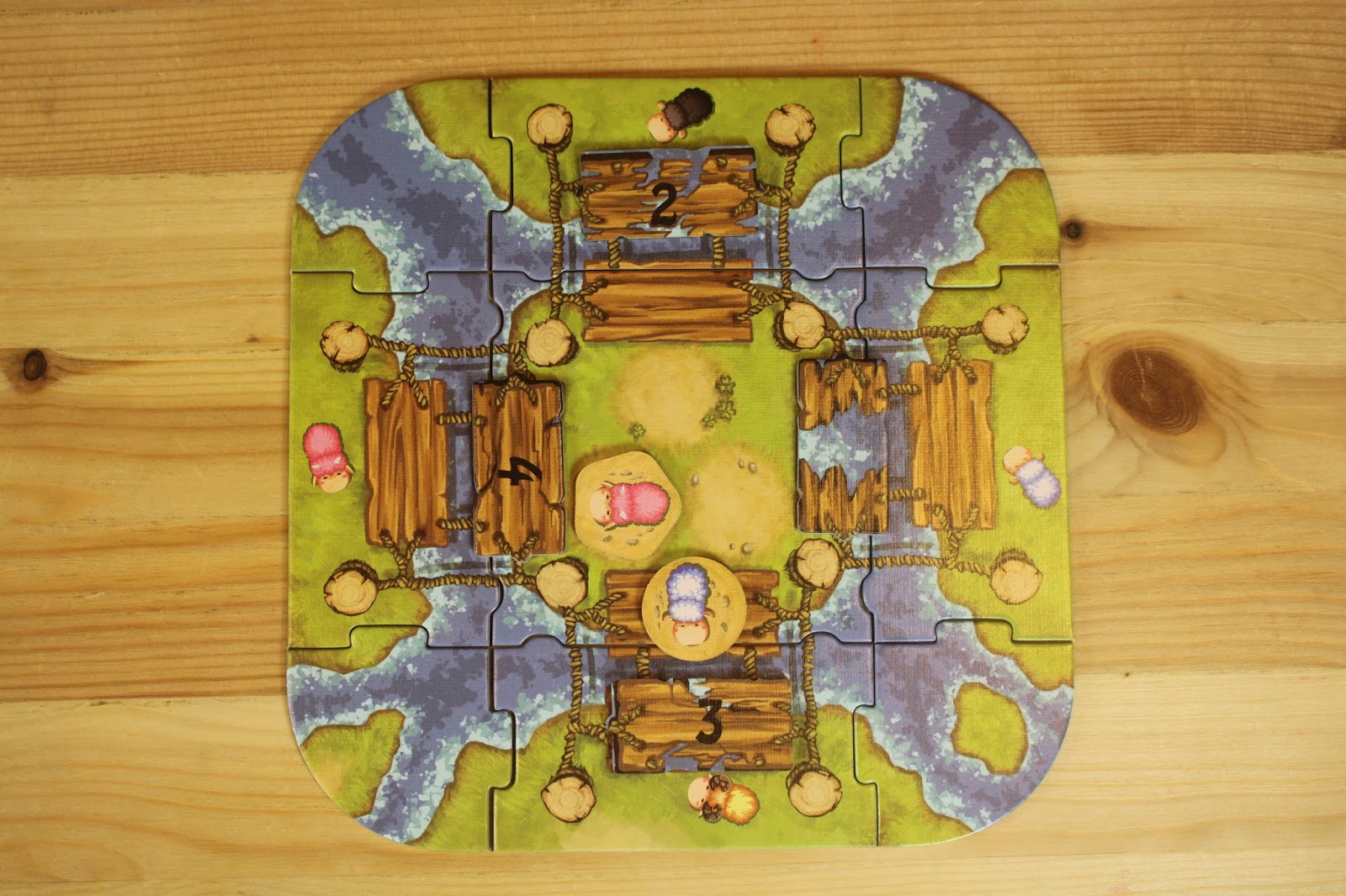 若移動到橋中間的草地時,這塊草地稱為「中央島」,如果有空位,玩家必須停在其中一格。如果沒有空位,就要依據小羊的位置來決定怎麼擺: