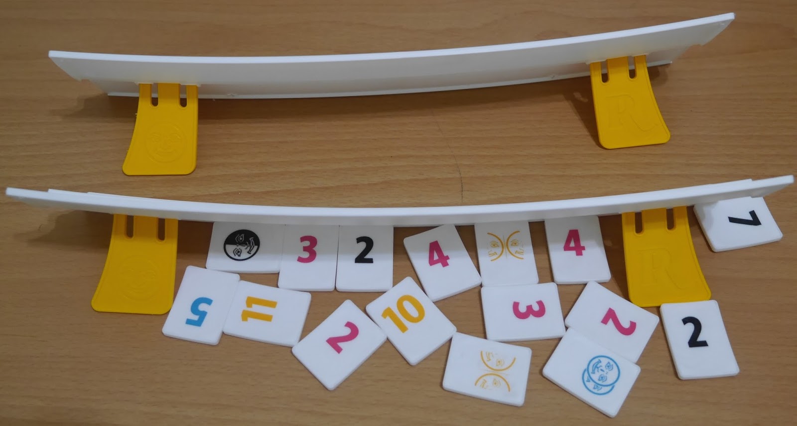 除了新的百搭牌之外,連整套拉密的顏色都跟舊版不一樣!!!是素雅的白,牌架增加了彎曲設計,解決了玩遊戲牌架容易倒的問題!!