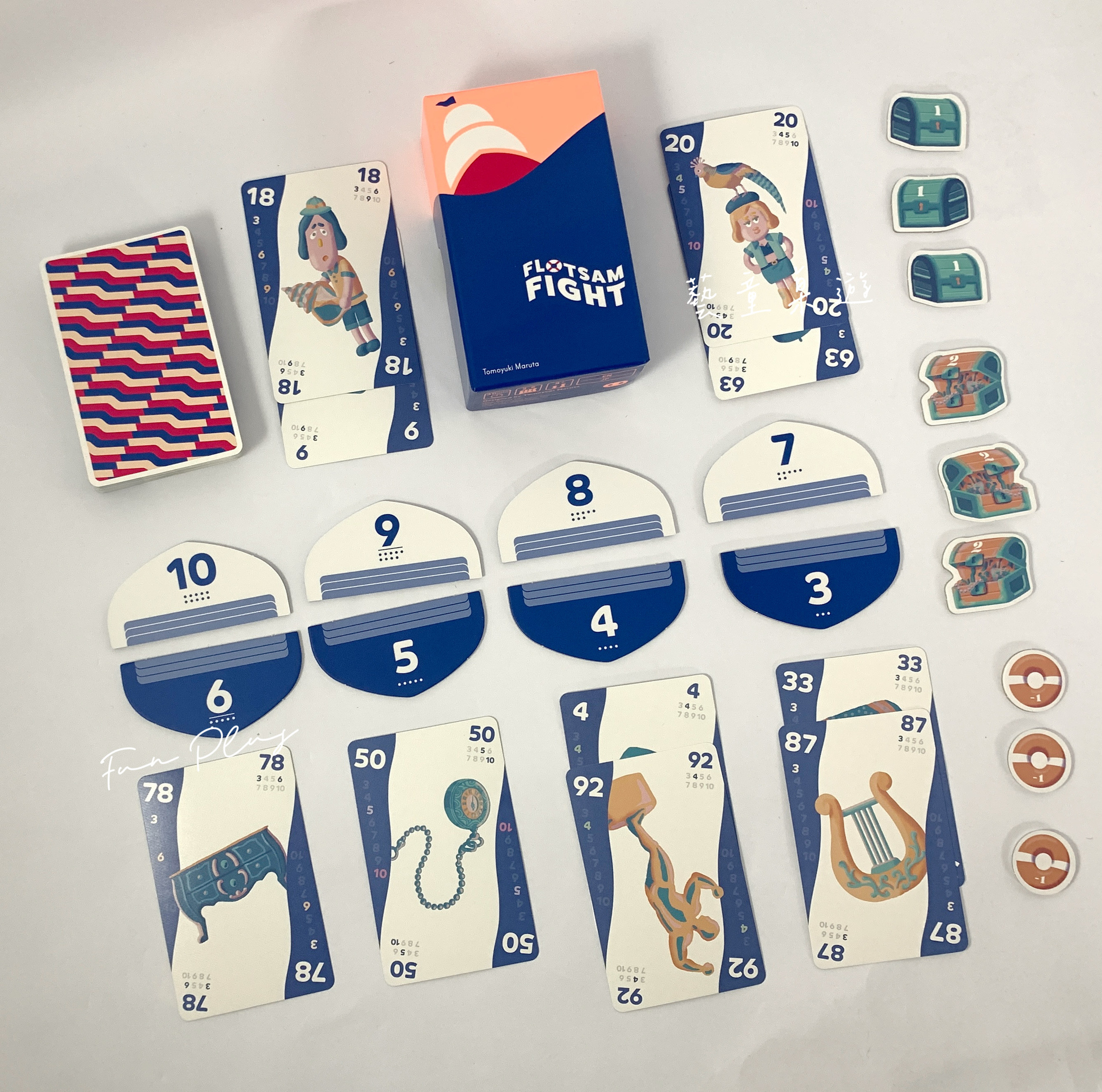 Flotsam Fight深海寶倍盒的遊玩刺激感會隨著參與的人數、玩家持有手牌數而有不同。參與者越多可以開的船越多,但到了後期就會越來越卡;相反的人數越少時,一開始就很有挑戰喔!觀察數字,選擇相對最佳的位置,真的很燒腦!你有看出牌面上數字彼此間的關係嗎?玩久了就記起來囉!